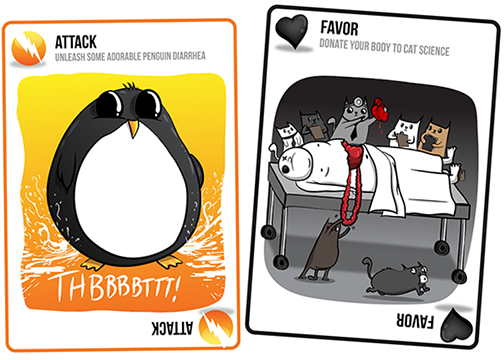 The mechanics are a little bit like the imploding kitten. The attack card forces the next player to go twice and you don t need to draw a card at the end of your turn. Unless you have a defuse card you re dead. Exploding kitten 4 cards you must show this card immediately.